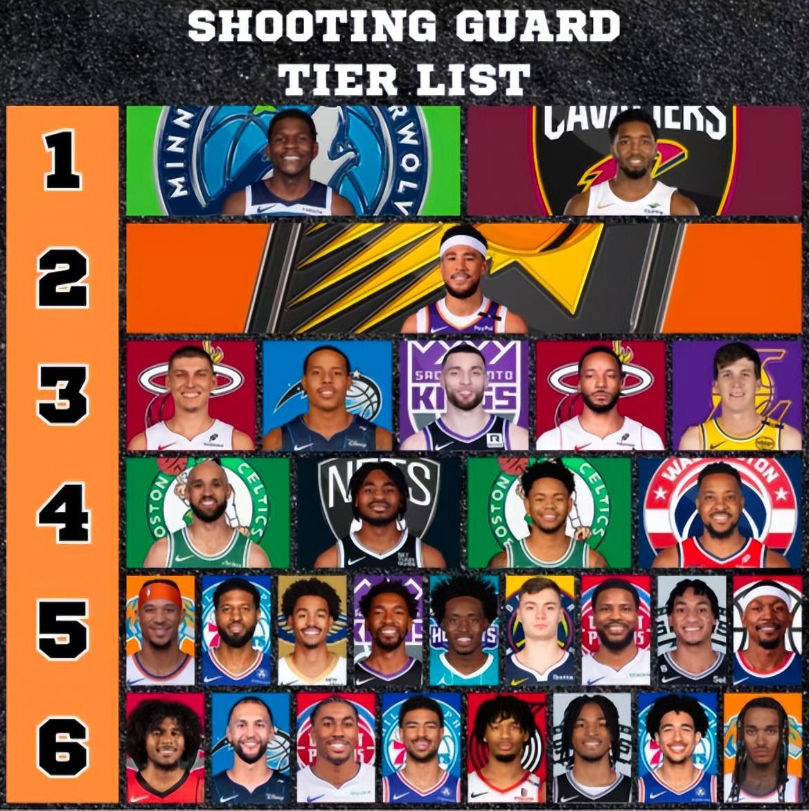 北京时间9月3日,美媒NBA.ninja为现役的得分后卫进行了分档,这与此前HoopsHype评选的25-26赛季前26得分后卫有所不同,因为分档有些球员就是并列的关系。
