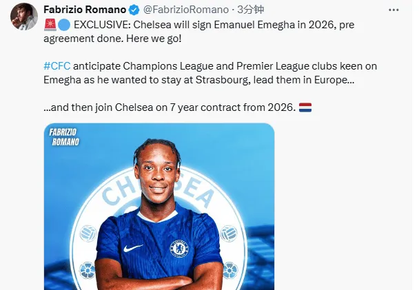 虎扑09月12日讯 切尔西将于2026年签下埃马努埃尔-埃梅加,预先协议已达成。